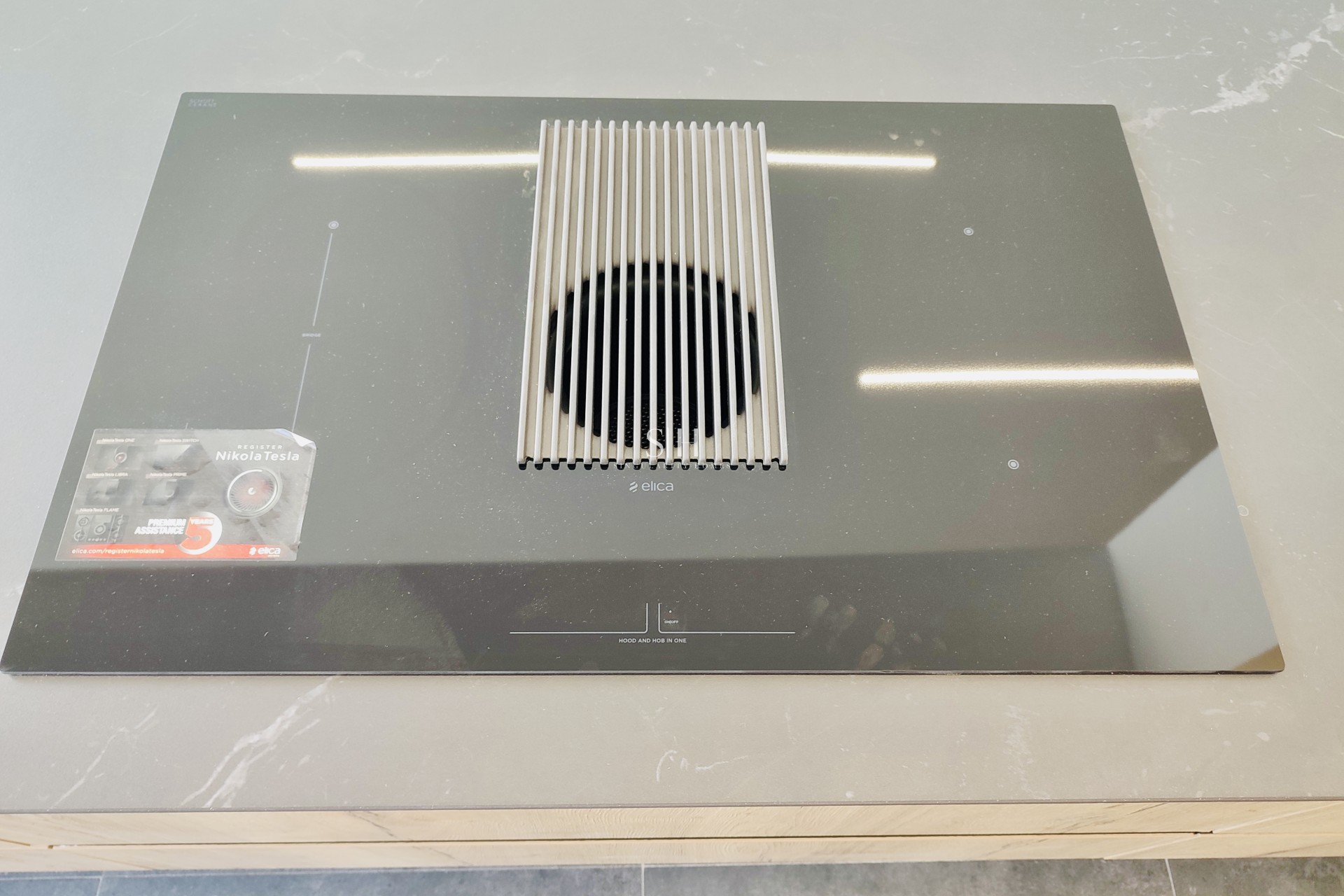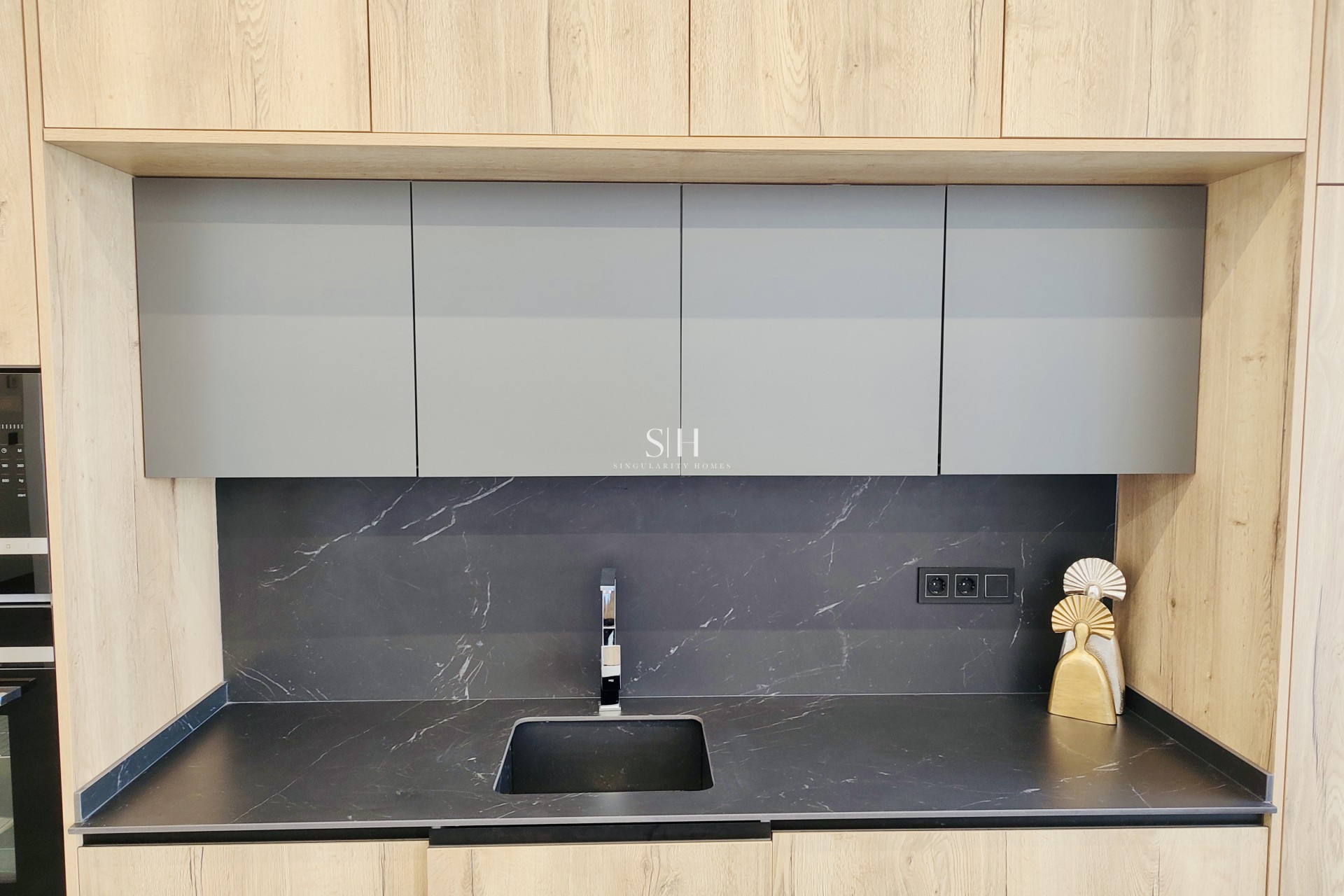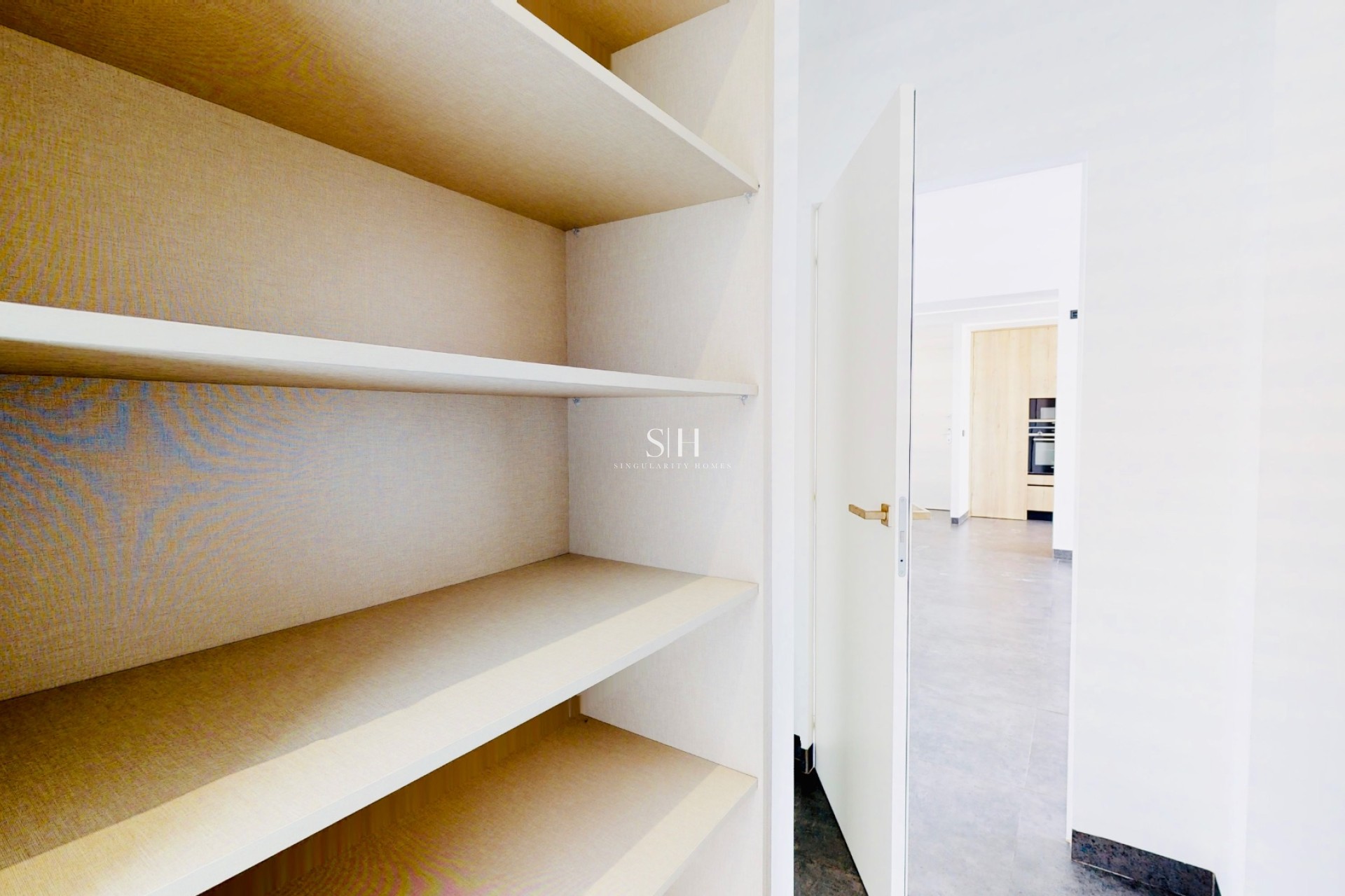 De keuken, met een elegante centraal geplaatste eiland, gaat over in een open ruimte die naadloos aansluit op de woonkamer, waardoor een heldere en uitnodigende sfeer ontstaat.