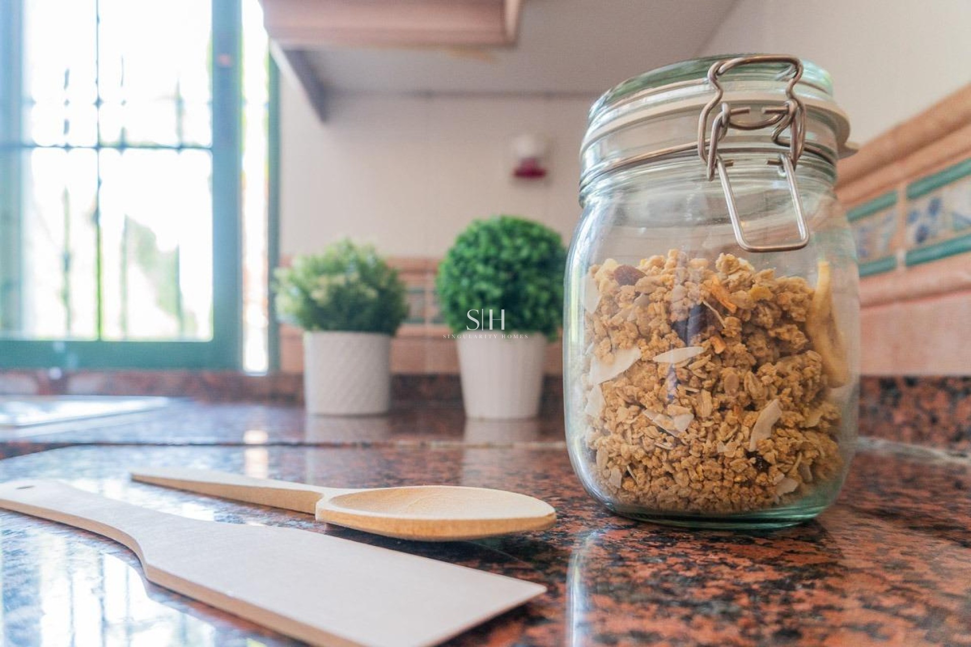 And the layout of the home: accessed from the garden, as mentioned, is the first terrace, facing south-southwest. It has sun all day long, but at the same time, being open to the garden and the street, it lets in a full breeze. This spacious terrace, with room for sofas and tables, leads to the main entrance of the home with a security door, which opens onto the spacious and bright living and dining area with a fireplace. It also has a separate kitchen with its own door and window, allowing you to cook without having to worry about odors and grease entering the rest of the home.